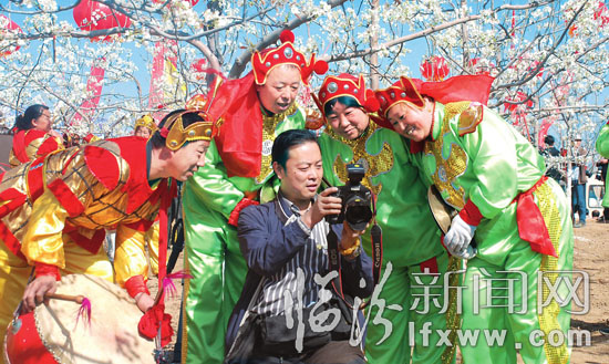 连日来,中国·隰县首届梨花节在隰县午城镇阳德塬万亩梨园开幕。万亩梨园的美丽风景吸引了众多游客前来观赏。 图为一名摄影爱好者在向众人展示自己拍摄到的梨园美景。本报记者 李自强 摄