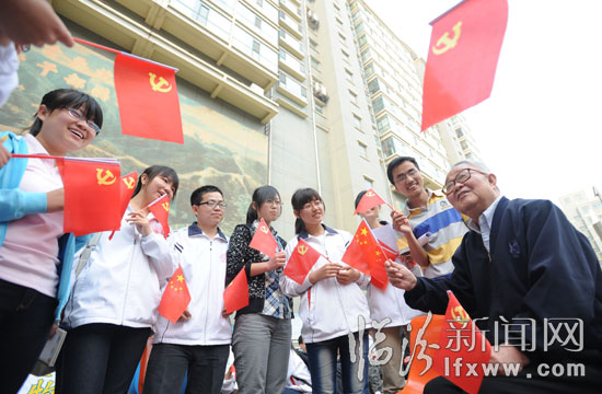 5月10日,临汾军分区干休所老党员李顺兴给学生讲述党的发展历程。