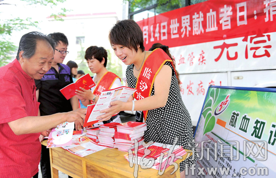 临汾新闻网讯(记者 闫锐鹏 摄)6月14日,市中心血站的工作人员在为市民讲解献血知识。当日是世界献血者日,市中心血站和市无偿献血志愿者开展了世界献血者日宣传活动,感谢多年来热心参与无偿献血的市民,号召更多人参与到定期自愿献血中来,去挽救更多的生命。