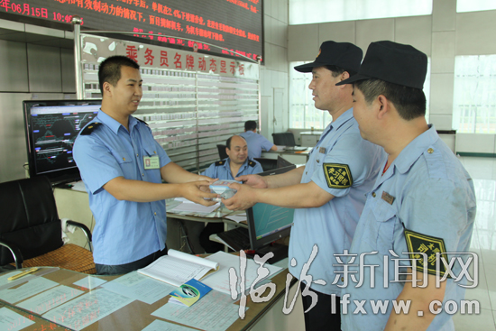 临汾新闻网讯(通讯员 杨立江 庞继福)暑运来临之际,为确保铁路机车乘务员的身体健康,侯马北机务段为每名机车乘务员配备装有防暑降温药品的“小药箱”,受到广大职工的普遍欢迎。图为6月15日,该机务段调度室出勤调度员正在为出勤机车乘务员发放防暑降温“小药箱”。