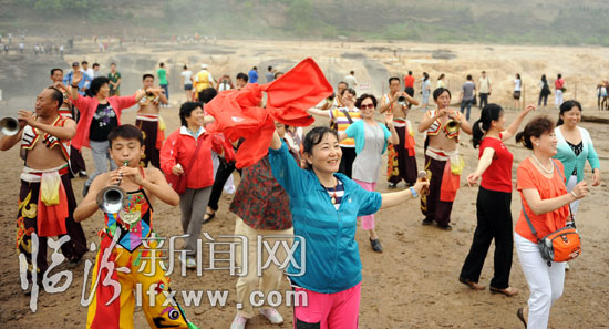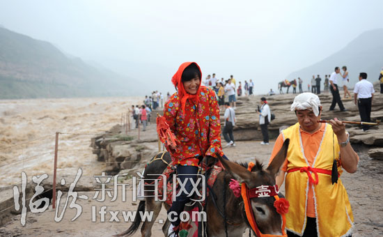 游客在黄河壶口瀑布景区拍照留念。