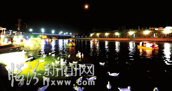 7月11日晚,在隰县紫川河上的水上乐园内,人与动物和谐相处。该县强力实施“生态立县”工程,大力改善人居环境,对城区的紫川河进行治理,昔日的臭水河已成为广大群众经常光顾的休闲乐园,极大地提高了当地居民的幸福指数。 记者 李虎威 摄