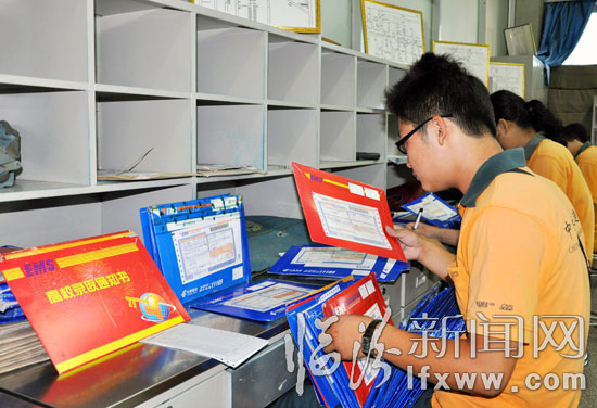 市邮政速递公司工作人员正在紧张分拣高考录取通知书。