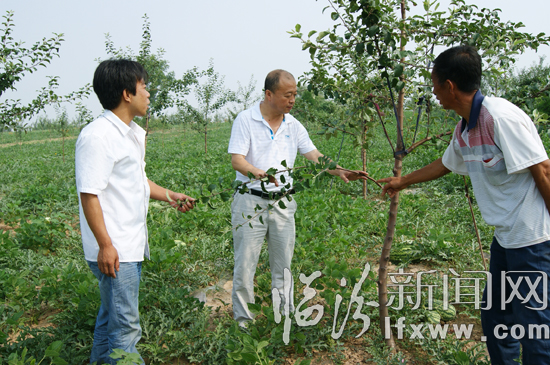 临汾新闻网讯 大宁县委县政府把苹果确定为该县“一县一业”的发展目标, 依靠苹果成了农民致富的新路径,全县上下各行各业全力以赴,齐心协力投身于发展苹果上,农林部门主打头阵,县林业局提供优质果苗;农委、果树中心从挖坑栽植,到管理技术、病虫害防治,都是紧扣环节,全程跟踪服务技术指导。图为农委主任陈旭平(中)和工作人员在太古乡仪里村果农白立新的指导,并询问管理情况。