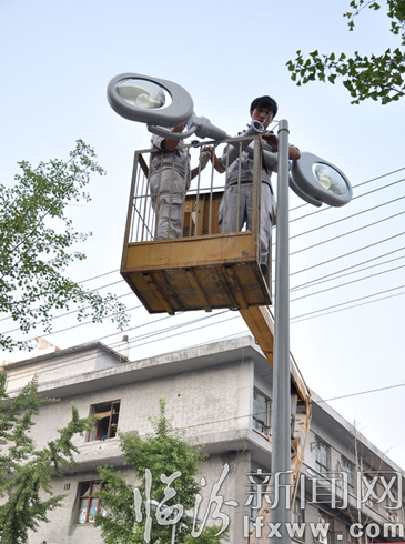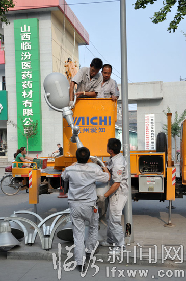 临汾新闻网讯 8月3日,记者在我市广宣街上看到, 市政路灯管理所工作人员正头顶烈日换装高效节能灯具。