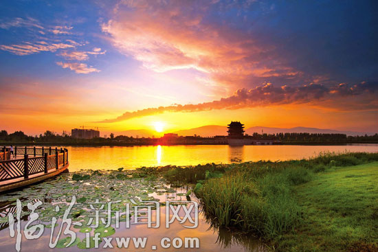 8月21日,经过雨水洗礼的汾河生态公园在夕阳下格外美丽。绚丽的夕阳、斑斓的云彩,清清的绿波、绿绿的草地构成一幅淡雅的水墨画。 记者 闫锐鹏 摄