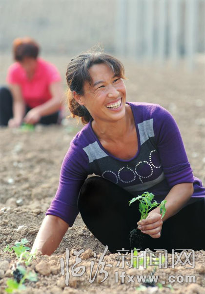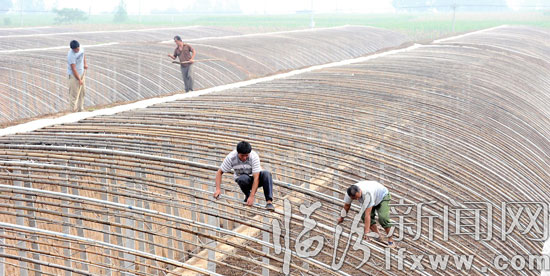 9月15日,村民张红霞在栽植西红柿苗。 9月15日,村民陈合民和妻子在大棚里施肥。 9月15日,来自山东的技术员在建大棚。
