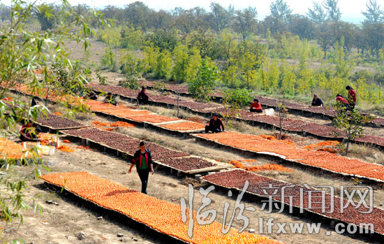 临汾新闻网讯 10月18日,襄汾县汾城镇北中黄村农民在凤坡岭晾晒柿饼。时下,鲜柿市场疲软,该村响应镇政府号召,发动农民对柿子进行深加工,柿子变身柿饼,保存期长,风味别具,市场后延,身价陡升,那一片片金黄色的“晒场”保证了农民增收。(记者 李虎威 摄)