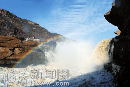 日前,黄河壶口瀑布出现“彩虹通天”的瑰丽景象,美丽的景象吸引了众多游客前来参观。 (闫海斌 摄)
