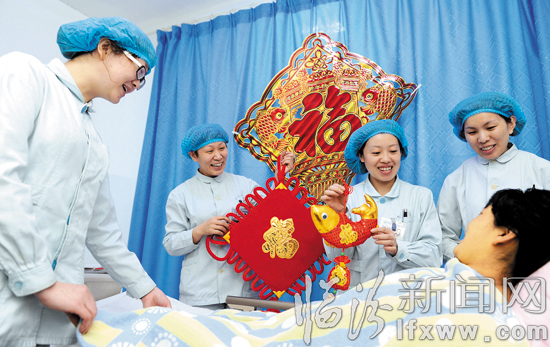 1月23日,市人民医院重症医学科的护理人员在向因病不能回家过年的患者拜年。当日是大年初一,市人民医院重症医学科的病房内充满了浓浓的年味,医护人员精心布置了病房,为患者提前包了饺子,在为患者做好精心护理的同时也让患者过了个温馨快乐的幸福年。