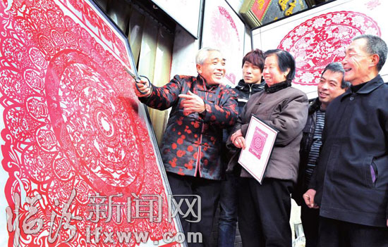 日前,襄汾县景毛乡北李村的张满喜老人在向街坊邻居介绍他的剪纸作品。今年70岁的张满喜用一个月的时间创作了《百龙促和谐》剪纸作品,该作品以襄汾陶寺遗址龙盘之龙为基础,结合民间传统剪纸技巧,寓意祖国民族大团结,社会和谐平安。 (记者 闫锐鹏 摄)