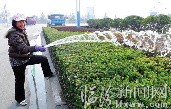 3月14日,市滨河路管理处工作人员在为绿化带浇水。连日来,市园林绿化部门对市区主干街道的树木、绿化带等进行了春浇施肥工作,同时对缺失、枯死树木进行了补栽,全面建设生态园林城市。