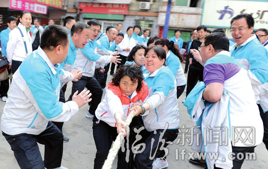 近日,市气象局、尧都区检察院、临汾移动通讯分公司联合举办了迎“五一”联谊运动会,通过拔河、篮球、健美操等项目的比赛,增强单位之间的沟通协作,让职工以饱满的热情投入到工作中,在快乐中迎接“五一”国际劳动节的到来。图为参加联谊运动会的选手在拔河比赛中角逐。 记者 闫锐鹏 摄