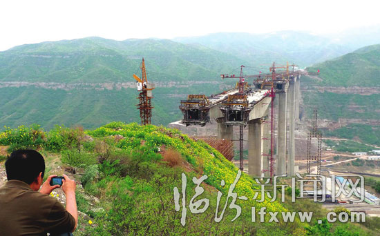 据现场施工的工人介绍,该桥由中铁十二局集团承建,总投资2亿余人民币,桥梁最高达140余米。按目前的施工进度,预计在8月份整个大桥就合拢了,那时黄河天堑将变通途。