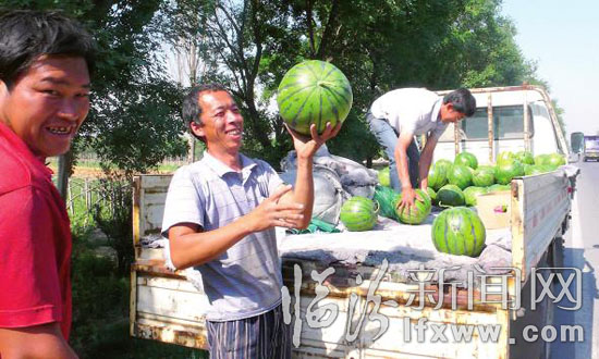 进入6月份,侯马市上马办张少村每天前来批发西瓜的省内外客商络绎不绝。张少村是远近闻名的西瓜村,种植西瓜有20多年的历史,每年都推出新品种,今年改良品种“授粉四号”皮薄瓤甜品质好,受到西瓜收购商的青睐。该村西瓜亩产量5000多公斤,每亩地瓜农可收入6000多元。图为瓜农在搬运西瓜。 冯文芳 摄