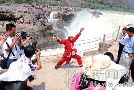 6月22日,端午小长假第一天,民间艺人正在吉县壶口瀑布表演节目。小长假期间,壶口瀑布迎来了众多游客,大家纷纷走出户外,感受大自然的魅力。记者 李自强 摄