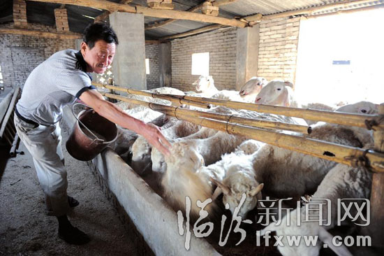 近年来,襄汾县南贾珍东张村在发展养羊、养猪的基础上,实施养殖规模化发展,由村里牵头对养殖户进行政策、资金和技术扶持,全部实现养羊圈养化,先后支持建设了5个千头羊场和5个千头猪场。图为村民宋志刚在羊舍添加饲料。 记者 闫锐鹏 摄