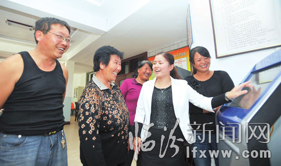9月13日,在吉县西关村村委会,果农薛文叶、郑玉贤、刘富刚、杨丽娟通过阳光农廉网查看苹果销售情况。