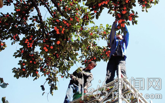 金秋十月,花果飘香,市绿化一队出动120余人,对8条街道1500余株柿子树上的柿子进行了采摘。图为工作人员在市区鼓楼东大街采摘柿子。记者 李自强 摄