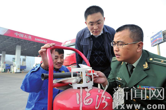 10月23日,霍州消防大队执法人员在加油站检查消防设施。十八大消防安全保卫战打响后,该大队共检查消防安全重点单位及九小场所531家/次,及时发现火灾隐患1065处,督促整改1031处,全市火灾防控工作稳中有降,未发生一起重大火灾事故。