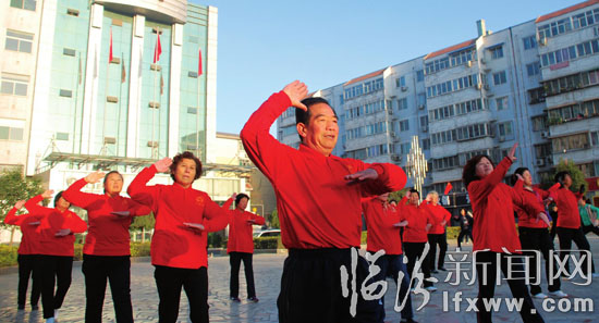 10月31日清晨,尧都区乡贤街办事处老年健身队正在排练健身节目,以广场舞等表现形式喜迎党的十八大胜利召开。