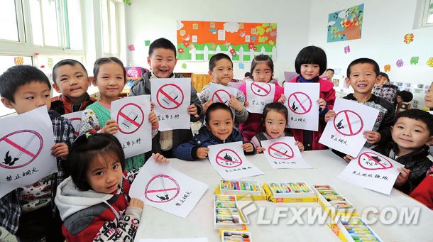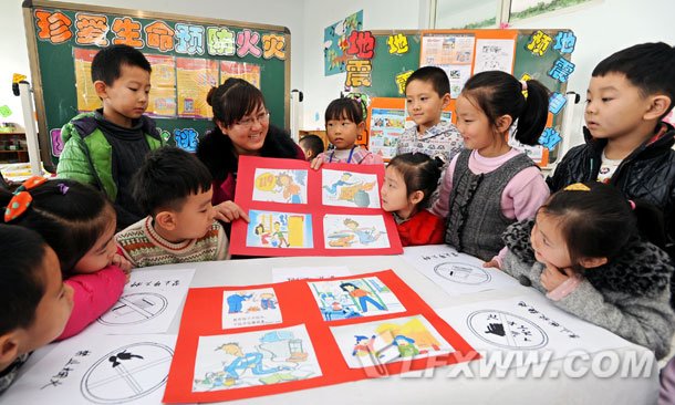 11月23日,山西师范大学附属幼儿园的孩子们在展示消防安全图表。
