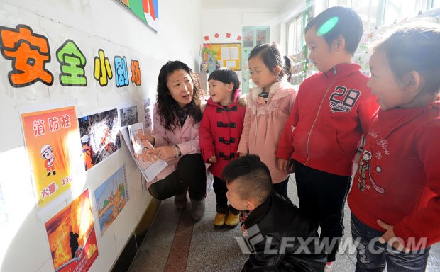 11月23日,山西师范大学附属幼儿园的老师在为孩子们讲解消防安全知识。