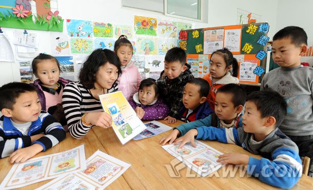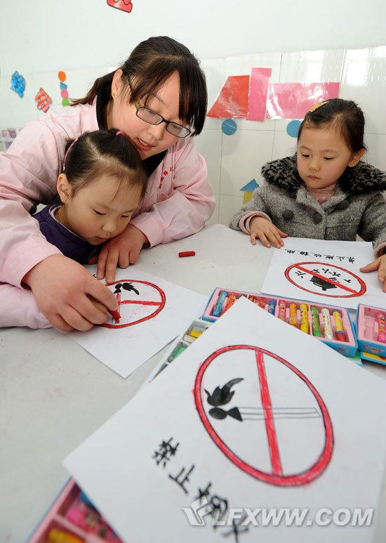 11月23日,山西师范大学附属幼儿园的老师在指导孩子们制作安全标示卡。