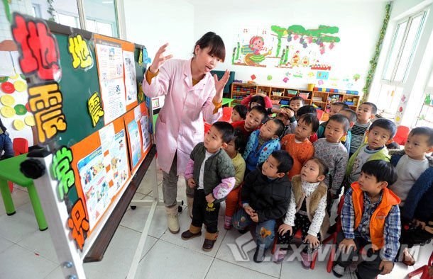 11月23日,山西师范大学附属幼儿园的老师在为孩子们讲解地震预防知识。