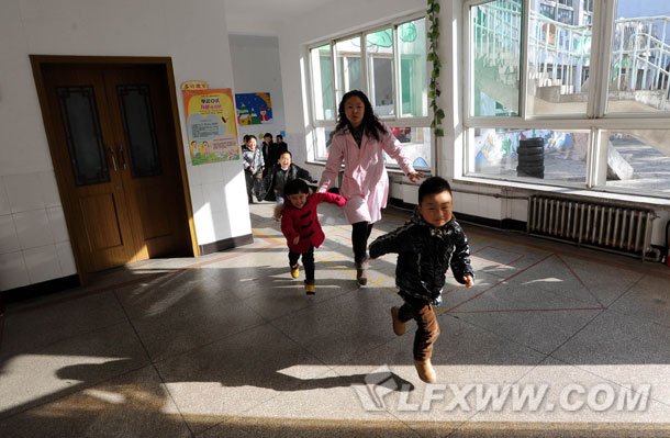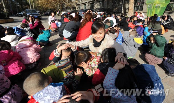 11月23日,山西师范大学附属幼儿园的老师在指导孩子们进行紧急避震演习。