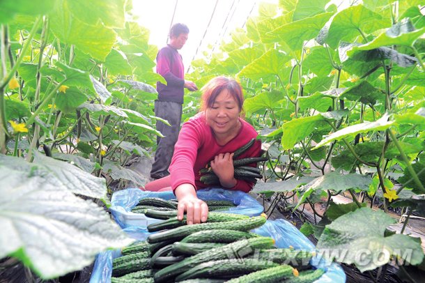 近日,走入浮山县张庄乡的大棚内,呈现在眼前的是一派春意盎然、生机勃勃的景象。进入冬季,反季节蔬菜销售两旺,菜农们抓住有利时机,加大菜苗的管理,争取蔬菜及早上市,在丰富市民菜篮子的同时,鼓了自己的“钱袋子”。图为菜农朱海军夫妇正在忙着采摘黄瓜。