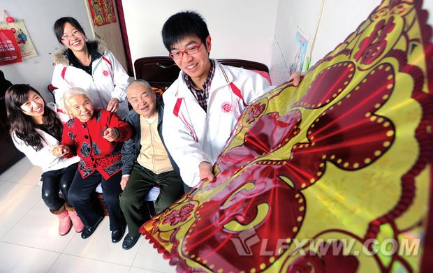 2012年12月30日,在尧都区中心敬老院,山西师范大学的青年志愿者在为这里的老人挂福字。连日来,该校青年志愿者协会开展了“温暖你我,志愿者在行动”主题活动,大学生志愿者们走进敬老院,为老人们送去爱心和祝福,在温馨欢乐的气氛里迎接新年。记者 闫锐鹏 摄