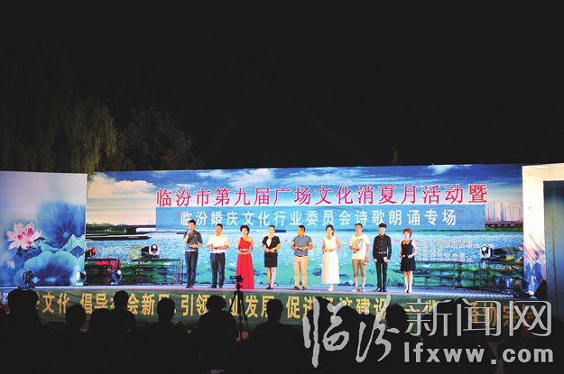 7月20日晚,我市第九届广场文化消夏月活动暨临汾婚庆文化行业委员会诗歌朗诵专场演出举行。党的赞歌》《尧乡婚赋》《奋进2014》等诗歌朗诵,慷慨激昂,高潮迭起,赢来台下观众阵阵掌声。据悉,临汾婚庆协会自去年成立以来,在加强行业自律,感恩回馈社会,提升行业整体形象等方面做了大量工作,得到了社会各界的认可,为促进我市婚庆行业健康规范发展发挥了积极作用。 振华 摄
