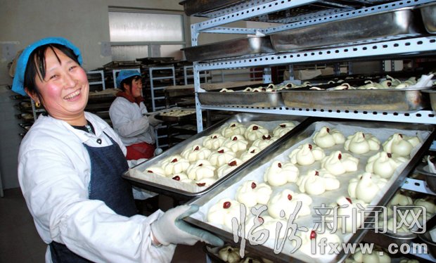 1月22日,在霍州市李曹镇源头村绿和祥福年馍生产基地,村民们正在加工年馍。该基地将工厂化生产和霍州年馍传统工艺相结合,致力于为消费者提供健康美味的放心食品,是霍州市唯一取得QS质量安全标志的加工年馍企业,生产的年馍销往临汾、运城、太原、西安、北京等各大城市,深受消费者欢迎。