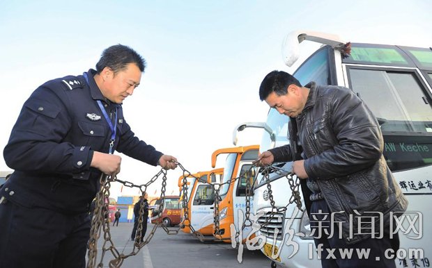 1月24日,临汾交警支队车管所干警班如利在对客运车辆配备的防滑链进行检查。春运临检开始以来,车管所民警加班加点,对全市公路客车、旅游客车、校车等重点车型进行全面检查、检测,力保春运安全。