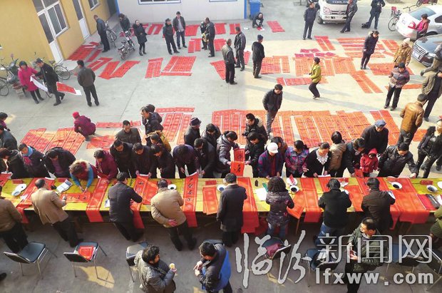 1月25日,市书协会员在尧都区沙桥村为村民挥毫书写春联。春节将至,市书协在沙桥村举办了“献爱心、送春联”活动,受到广大村民的热烈欢迎。