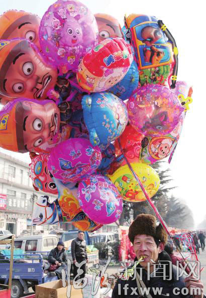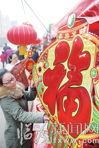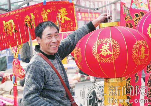 尧都区乔李村的集市上,村民正在挑选大红灯笼