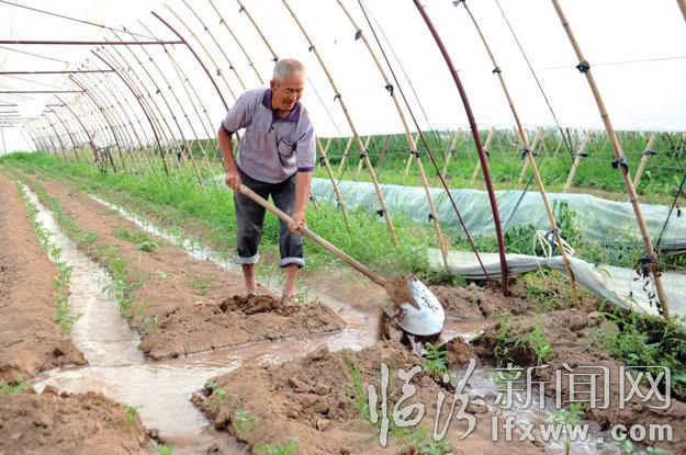近日,翼城县庆丰农场工人正在为刚定植的西红柿进行引水灌溉。今年庆丰农场300余亩西瓜喜获丰收,他们又紧锣密鼓定植了秋播西红柿200余亩,预计亩均产量在万斤以上,将有力地促进农场的快速发展。 李茁壮摄