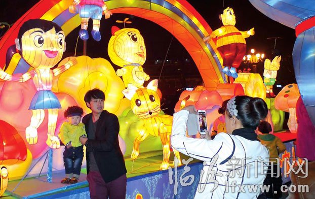 2月18日,市民在鼓楼广场灯展前合影留念。
