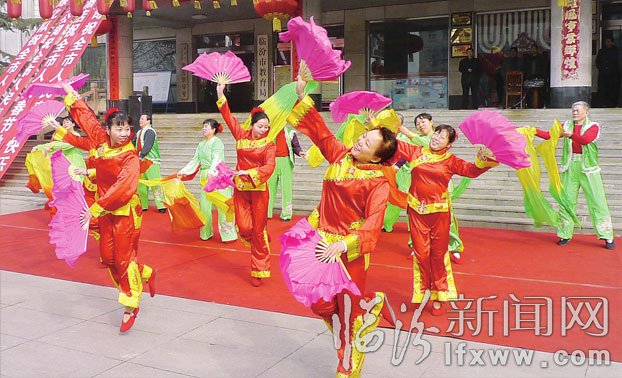 2月15日,市区水塔社区的群众正在市教育局门前进行文艺表演。