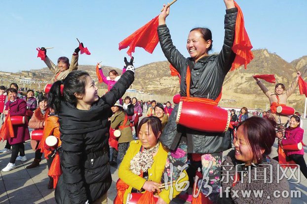 刘睿是吉县吉昌镇上东村的一名大学生村官。她充分利用自己擅长文艺表演的优势,组建成立了百人女子腰鼓队。担任领队和教员的她,利用业余时间,教队员们排练节目,并带领女子腰鼓队在春节期间进行表演。图为2月20日,刘睿在指导农民排练节目。(陈健翔 张保华 摄)
