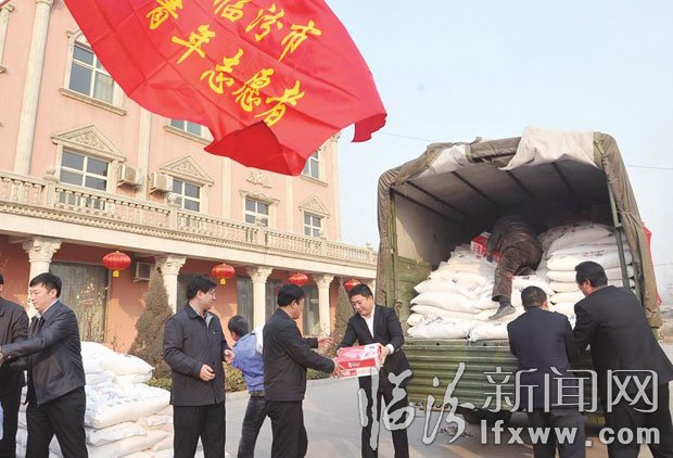 2月22日下午,团市委、市青联、市青企协将650袋面粉、500箱方便面、500件矿泉水捐赠给洪洞县甘亭镇灾区人民。图为志愿者在卸载救灾物资。