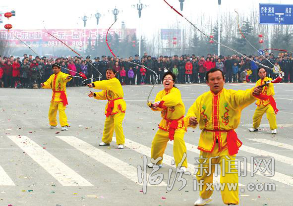 中华麒麟鞭的表演让在场的市民大开眼界,只见几名表演者手持由牛皮手柄串联不锈钢链尾接尼龙鞭鞘的鞭具,舞起来发出“啪啪”的巨大响声,声音清脆,穿透力极强。同时中华麒麟鞭强身健体,是一项老少皆宜的功夫运动。随着麒麟鞭一起一落,几名表演者拿在手中的报纸、气球被一一打破,一幅“构建和谐靓丽临汾,努力创建美好家园”的条幅缓缓落地,映入人们眼帘。