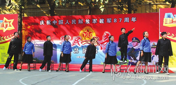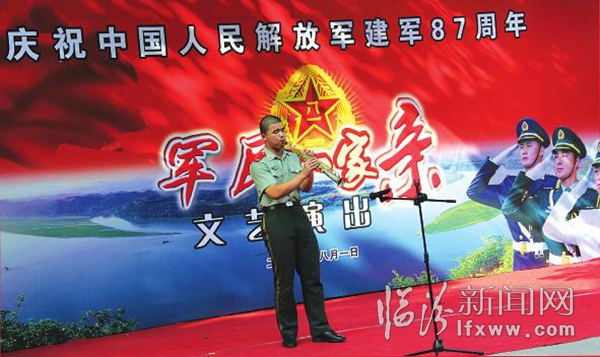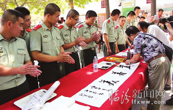 7月30日,为庆祝中国人民解放军建军87周年,临汾市婚庆行业协会委员会同市内一些老艺术家及黄河文艺的小朋友们来到武警驻临某部举行了“军民一家亲”活动及文艺演出。本次活动共有12位书画家参加及近百位演员参演,书画家们“舞文弄墨”吸引武警战士目光,演员们精彩的表演带给军营带来了欢乐气氛。一位武警战士表示,此次活动丰富了军营文化生活,拉近军人与老百姓之间的距离,使他们受到极大鼓舞。