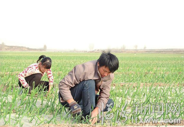 曲沃县北董乡大力发展特色农业,目前栽植大葱5000余亩,促进了农民增收。3月7日,北董乡东下郇村王永录夫妇在自家的5亩地中为葱苗除草。(韩晋昊 摄)