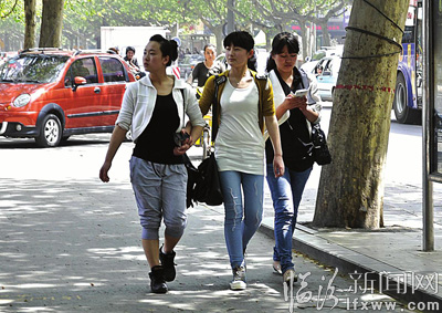 4月14日,我市最高气温飙至32℃,市民大呼“夏天来了!”,有不少人甚至穿上短袖T恤、短裤、丝袜。图为外出逛街的姑娘们身着春夏装。