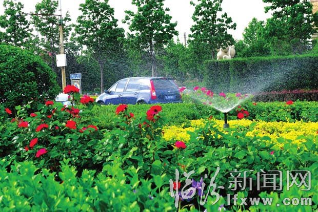5月12日,记者在尧都区迎宾大道看到,道路中央的绿化隔离带灌溉措施由传统的人工浇灌改为自动的喷灌方式。据了解,这种自动喷灌的方式非常省水,同时,还给我市增添了一道亮丽的风景线。