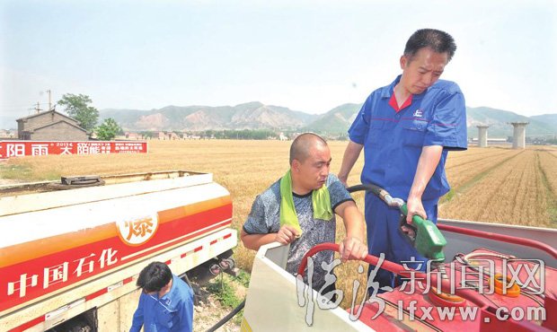 6月3日,中石化临汾石油分公司夏收服务队在侯马市上马办事处驿桥村麦田为收割机加油。夏收以来,该公司组织开展“方便农机户,服务到地头”专项支农活动,确定定点支农加油站42座,开辟农机用油专用通道、设置支农服务台,并组织40余辆配送车奔赴夏收一线,送油到田间地头。