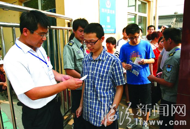 图为6日下午,考生们准备进入新华学校看考场。考点工作人员严格检查考生证件,并提醒考生在考试时应把准考证、身份证随身带好,千万不要因找不到证件而影响考试。 记者 苏亚兵 摄