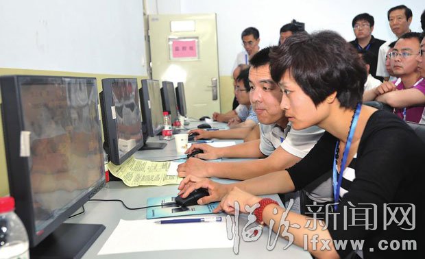 在临汾第一中学考点,监考老师通过监控视频对考场进行监考。记者 李虎威 摄